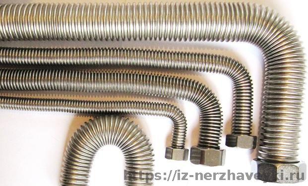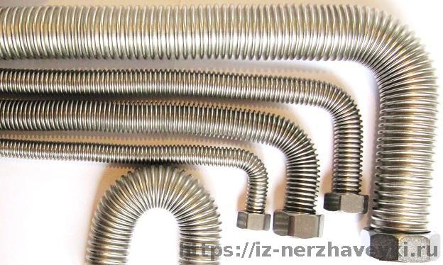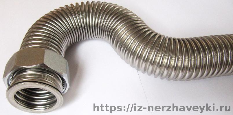 Гибкая подводка 2 1/2 дюйма из нержавеющей стали пришла на смену старой из резинового шланга оплетённого проволокой. Гибкая подводка 2 1/2 дюйма изготавливается из гофрированной трубы, но и она сильно отличается друг от друга. Гибкая подводка для газа изготавливается из 202 нержавейки в ней мало никеля концовки изготовлены из железа которое ржавеет, но для газа эти технические характеристики подходят. Гибкая подводка для воды изготавливается из 304 нержавейки там в 10 раз больше никеля. Точные данные можно посмотреть в ГОСТ. Гибкая подводка для воды 2 1/2 дюйма сильфонного типа универсальная и подходит для любых трубопроводов. Важно и то что у сильфонной гибкой подводки есть все основные диаметры а длина изготавливается под заказ. Теперь можно обойтись без сварных работ при монтаже котельных. Это просто и безопасно для помещений маленьких размеров из дерева.