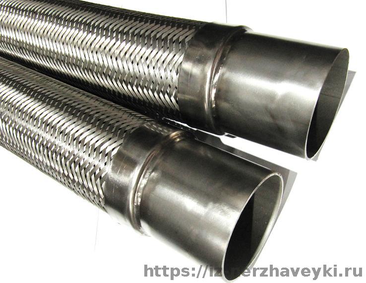 Рукав высокого давления из нержавеющей гофра трубы усиленной оплеткой из нержавеющей стали производится с разными концевыми соединениями американки, накидные гайки, фланцы, БРС, патрубки под приварку. И рассматривая металлорукав высокого давления под приварку, в виде универсального решения, с разными редкими соединениями. Большинство заказчиков сталкивались с заменой старого рукава или замены участка трубы с дорогими соединениями. И вопрос иногда не только что большие сроки по изготовлению но и с невозможностью купить данное соединение из европы. К примеру фланцы SAE. Это европейское специальное соединение которое состоит из переходника SAE для приварки в раструб ( патрубок ) и половинок фланцевых SAE. Патрубки диаметром 100 мм SAE и раньше поставлялись по спец заказу, с огромным сроком поставки. Вытачивать из цельной болванки диаметром 125 мм снимая за один проход токарю меньше 0,5 мм получим золотую деталь. Поэтому лучшее решение отрезать данное соединение патрубок так чтобы к нему можно было приварить металлорукав под приварку. Есть к примеру еще одно очень дорогое соединения фланцы Шип Паз из нержавеющей стали если у вас уже есть это соединение которое приварено например к трубе с многими изгибами то убрав вырезав эту кривоколенную трубы можно вварить туда рукав высокого давления под приварку из нержавеющей стали. Такой рукав высокого давления в виде гибкого нержавеющего патрубка применяют и в неразъемных соединениях трубопроводных систем. Такой РВД рукав высокого давления служит как компенсатор при удельном расширении труб. Более длинные МРВД металлорукава высокого давления к примеру смонтированные петлей в виде подковы гасят большие вибрации, работают на сгибание и разгибание. По факту это металлический гибкий шланг который выдерживает высокие и низкие температуры. А также большое положительное давление, и отрицательное давление ( вакуум ). НРВД нержавеющий рукав высокого давления состоит как бы из двух технических характеристик, это сам металлорукав высокого давления и концовки для крепления, и у них разное рабочие давление. Поэтому указывается рабочие давление на сам рукав. К примеру рукав высокого давления с фланцами и рукав высокого давления с клампами по факту рассчитаны на разное давление. Но сам металлорукав будет выдерживает и маркироваться как одно и тоже давление.