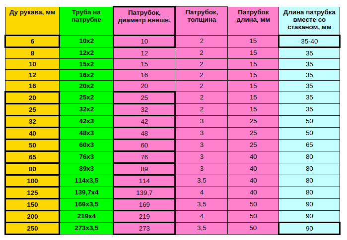 Ниже таблица с размерами патрубков у металлорукавов под сварку: