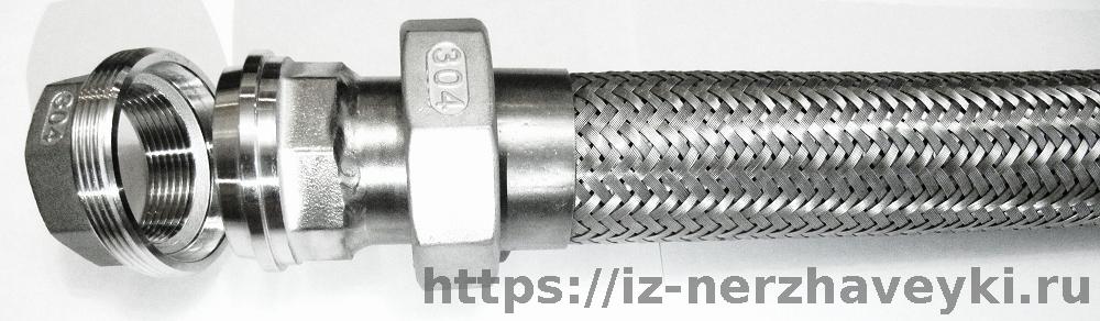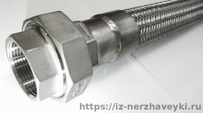 Рукав высокого давления с американкой — это металлорукав из нержавеющей стали с приваренными по краям разъемными соединениями американка. Соединение американка представляет из себя фитинг из нержавеющей стали состоящий из трех частей. На двух частях фальцы для соединения между собой и третья часть накидная гайка для стягивания этого уплотнения. Уплотнение может быть за счёт плоской прокладки или за счёт конуса. На металлорукавах высокого давления ставятся американки с конусом, это соединение выдерживает большие температуры и давление. Но важен еще вид соединения МРВД металлорукава с оборудованием или трубопроводом. При заказе металлорукава с американкой нужно указать какая резьба американка вр ( внутренняя ), американка нр ( наружная ), американка под приварку. Металлорукав с таким видом соединения дороже чем соединение с накидной гайкой. Накидная гайка по факту это пол американки и точно такое же разъемное соединение. Но иногда к примеру труба или ниппель бывают тонкостенные и накидная гайка с плоским фальцем не сможет притянуть прокладку к трубе в 1 мм ( это стенка для примера ) она проста провалится в трубу. Поэтому металлорукав высокого давления с американкой в таком случае решает эту проблему. Металлорукав высокого давления с американкой сделаны полностью из нержавеющей стали AISI 304. Это марка европейского стандарта которая соответствует советской марке 09х18н9 это состав в процентах кроме железа первая цифра углерод 9%, хром 18%, никель 9%. Государственный стандарт для легированных нержавеющих сталей и сплавов для 09х18н9 можно посмотреть в советском ГОСТ 5632-72 или в новом переизданном с 1 января 2015 года российском ГОСТ 5632-14. Если рассматривать технические характеристики металлорукавов высокого давления из нержавеющей стали то больше половины это показатели на нержавейку AISI 304. Это и температурные режимы, и кислотостойкость, и морозостойкость, и износостойкость. Что позволяет применять металлорукава из нержавеющей стали в таких отраслях как: медицина, нефтехимия, взрывоопасные производства, пищевая промышленность, горно-обогатительная, горно-добывающая, химические производства, в системах отопления и водоснабжения, с паровым оборудование, а также с криогенными газами, с выхлопными газами, на стекольных производствах и меднолитейных и сталелитейных. Для предприятий с очень высокими температурами, металлорукав можно дополнительно укомплектовать термозащитным рукавом. Сегодня самые высокие показатели на термозащитные рукава это у бренда пироджакет. Рассматривая усиления нужно отметить усиление металлорукавов пружинами. Это увеличевает срок эксплуатации рукавов высокого давления с цикличным сгибанием и разгибанием.